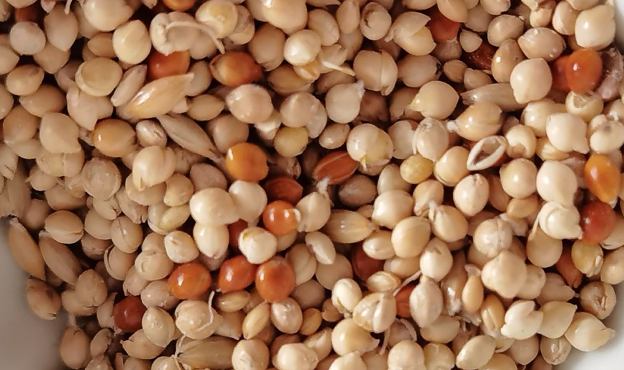 Powyżej widać "Germix Exotic", który idealnie nadaje się dla amadyn - są też mieszanki dla innych gatunków. Moje ptaki uwielbiają te ziarna i nie ma żadnego problemu z ich pobieraniem - w mieszance są bowiem dokładnie te ziarna, które znają na co dzień z karmy podstawowej - czyli różne gatunki prosa i kanar. W powiększeniu wygląda tak (jak widać nie każde ziarno ma wystający "kiełek" - są suszone na wczesnym etapie kiełkowania, gdy ziarno ma największą wartość odżywczą):